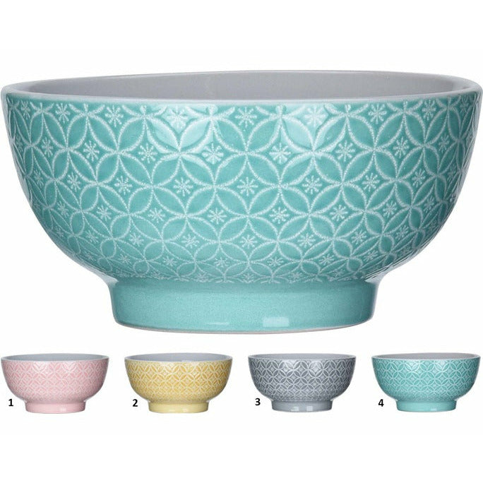 Vas din ceramica cu o capacitate de 415ml cu design in relief. Disponibil in 4 culori diferite. Este potrivit pentru cuptorul cu microunde si masina de spalat vase. Sigur pentru alimente.