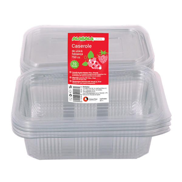Set 10 caserole alimente dreptunghiulare cu capacitate de 750 cc, fabricate din material plastic (PET), transparente, prevazute cu capac care etanseaza. Practice si utile in bucatarie. Ideale pentru depozitarea alimentelor in frigider, dar si pentru transportul acestora.