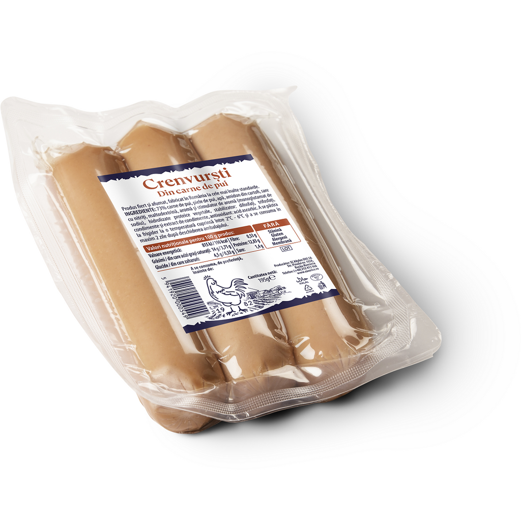 Crenvursti doar din carne proaspata de pui, crescut si sacrificat in Romania, produs la cele mai inalte standarde de calitate. Produs fiert si afumat. Continut de carne 73%.