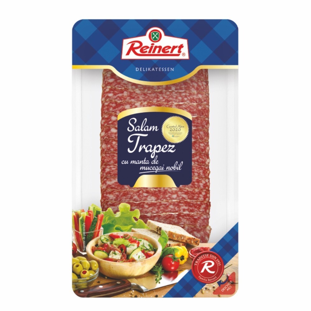 Un gust surprinzator, rafinat, dat de savoarea mucegaiului nobil, in aceeasi forma unica, trapezoidala specifica gamei Trapez de la Reinert. 100g de produs se obtin din 114g carne de porc, 34g de slanina si 0,25g manta de mucegai nobil comestibila.