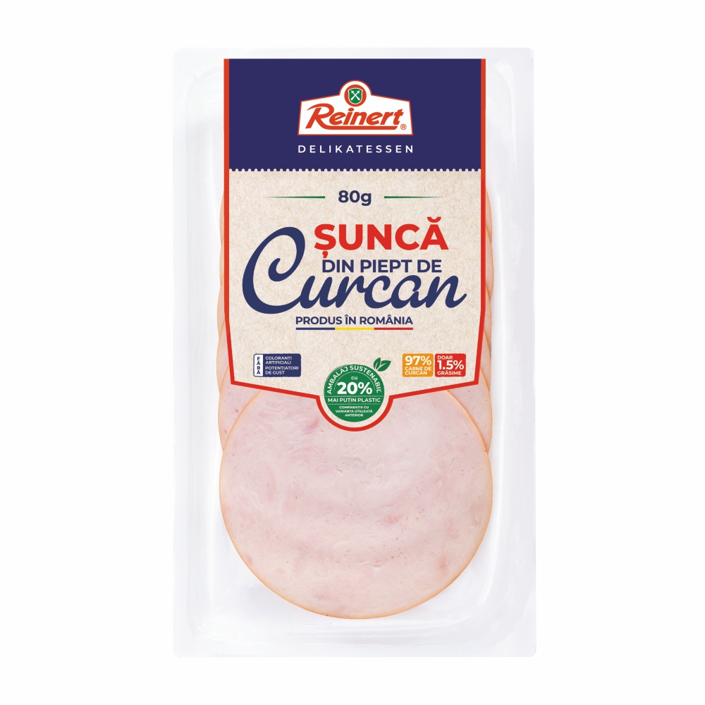 Ingrediente: 97% piept de curcan (origine Romania), apa, sare, condimente, dextroza, stabilizatori (difosfati de sodiu), antioxidant (ascorbat de sodiu), conservant (nitrit de sodiu). Produs fara membrana, ambalat in atmosfera protectoare. Poate contine urme de telina, mustar, lapte si produse derivate.