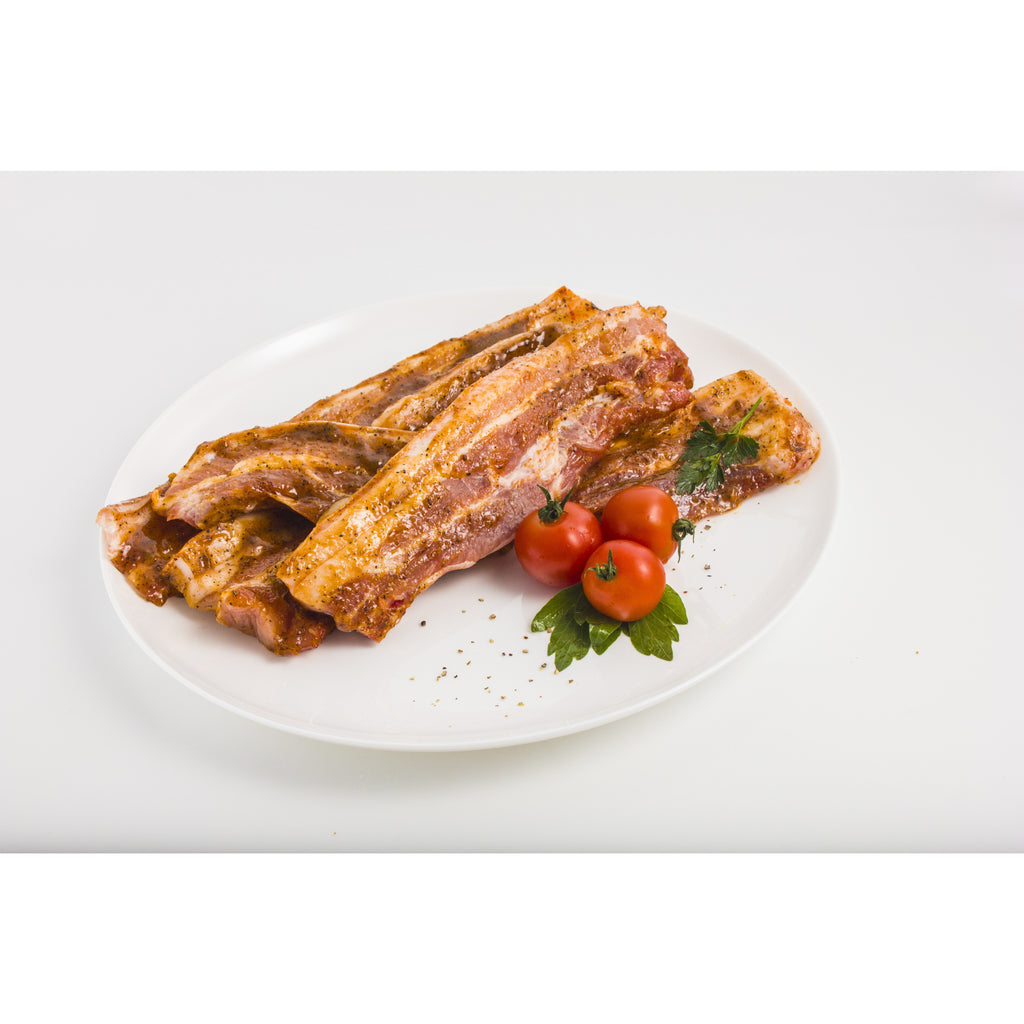 INGREDIENTE: piept de porc cu os, ulei vegetal, condimentesi extracte de condimente, sare, zahar, caramel.