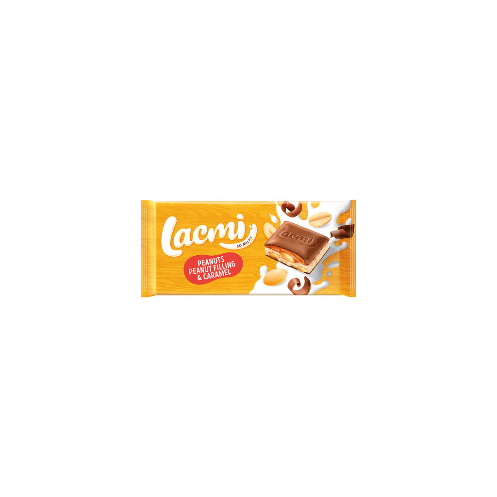 Lacmi, ciocolata cu lapte cu arahide, caramel si umplutura de arahide. 87g.