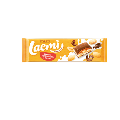 LACMI ciocolata cu cea mai mare proprtie de lapte (51%), cu arahide si crema delicioasa de arahide si caramel.