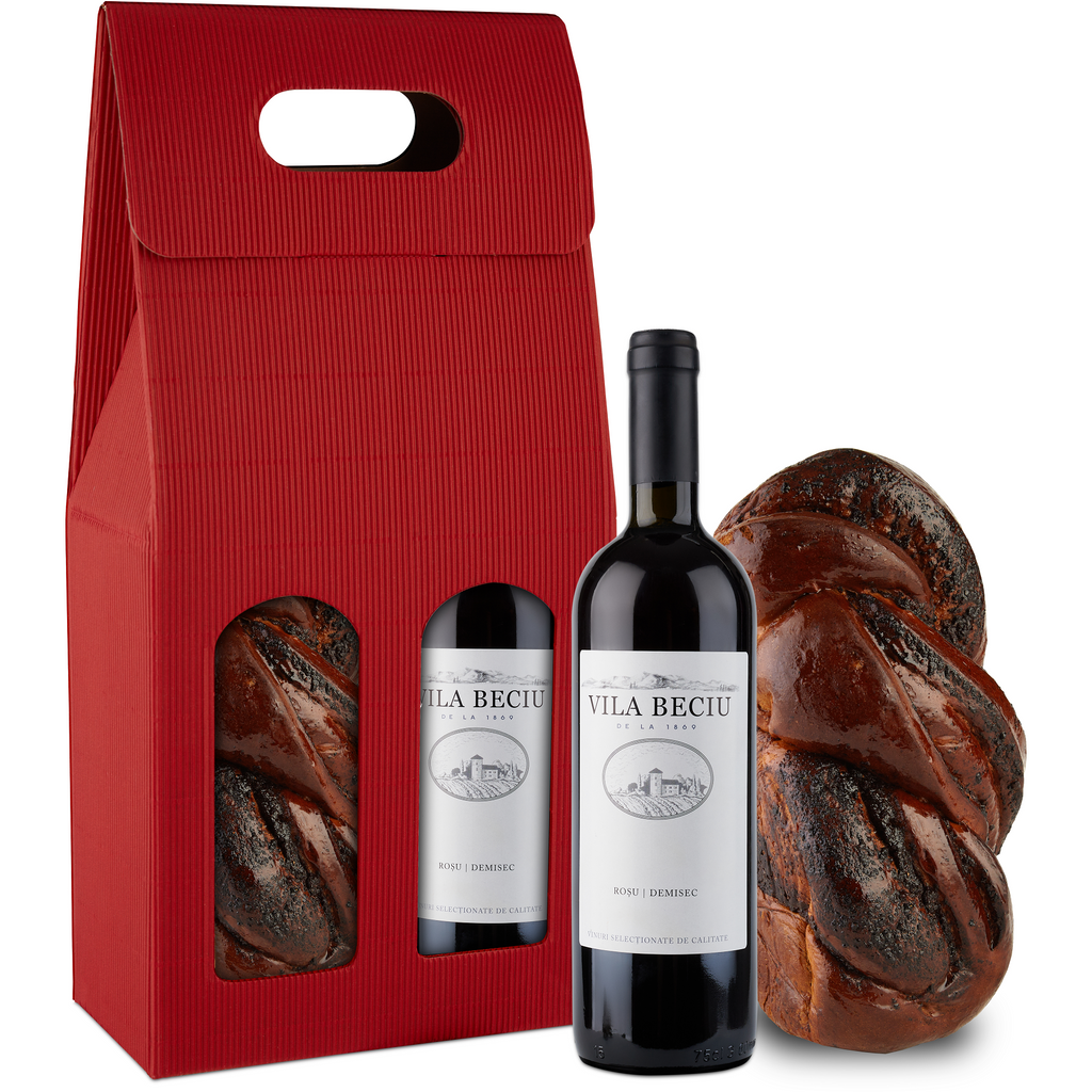 Ingrediente : Cozonac cu nuca Vel Pitar 400g. Ingrediente: faina alba de grau 550, apa, zahar, drojdie, agent de umezire (sirop de sorbitol), gluten din grau, nuca (2,2%), uleiuri vegetale (palmier, floarea-soarelui in proportii variate), maia deshidratata din grau, fibra de cartofi, sare iodata, cacao, emulsifianti (mono si digliceride ale acizilor grasi, esteri ai acizilor mono si diacetiltartric cu mono si digliceridele ale acizilor grasi, stearoil-2-lactilat de sodiu), fructoza, faina de soia, spartura de soia, amidon de porumb, conservant (acid sorbic), ou praf, alcool etilic de origine agricola, otet de vin , arome, agent de tratare al fainii (acid ascorbic, L-cisteina), acidifiant (acid citric), colorant (beta-caroten). Poate contine urme de seminte de susan si lapte. Produs tratat cu alcool etilic de origine agricola. Vin rosu Vila Beciu 75cl. Concentratia alcoolica 13,5% vol. Contine sulfiti.