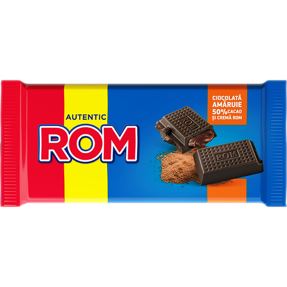 Ciocolata amaruie 50% umpluta cu crema de rom.