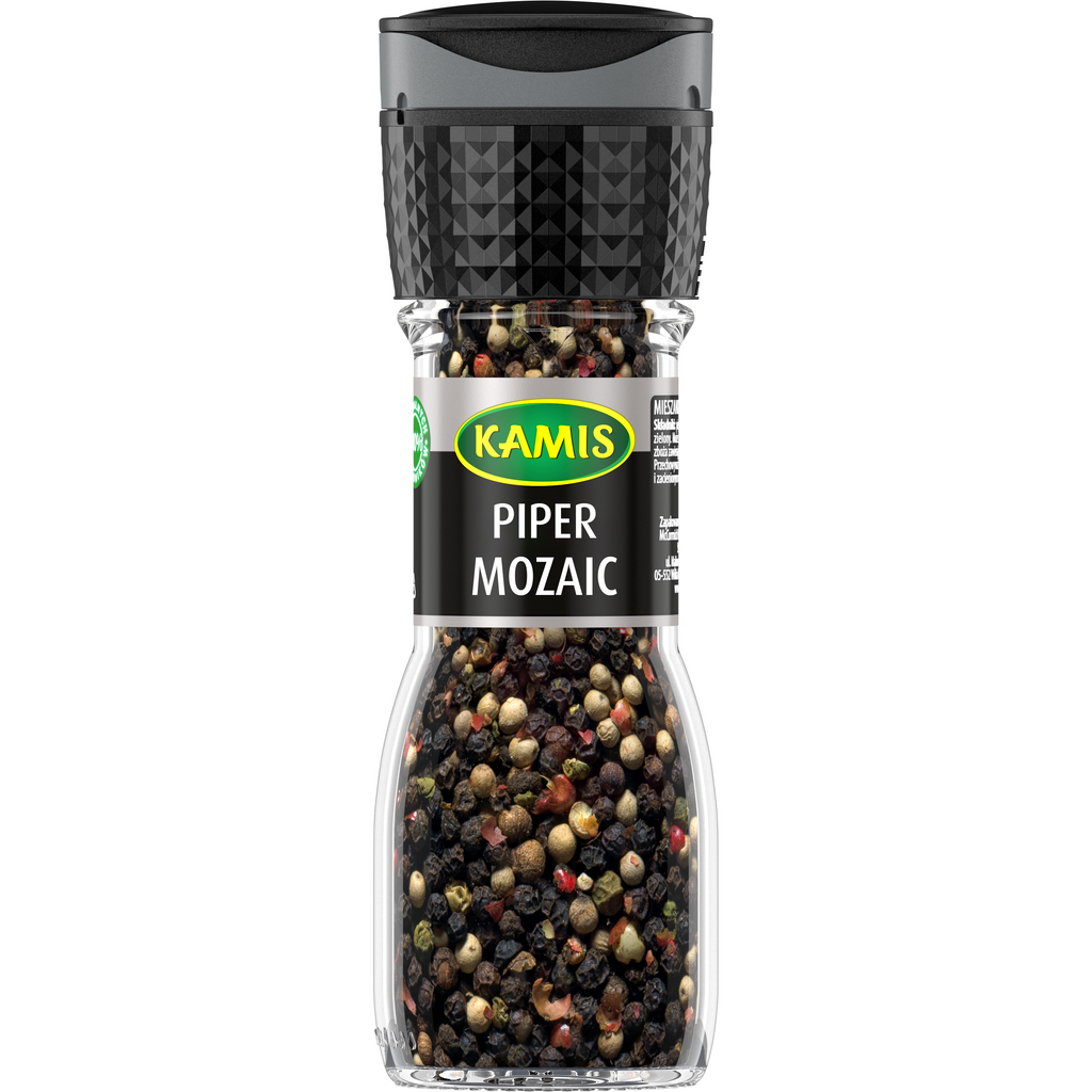 Piperul mozaic Kamis este un mix unic de piper negru, alb, verde si roz, in care se pot distinge notele caracteristice fiecarui tip de piper. Spre deosebire de piperul negru, piperul alb are un gust mai delicat si o aroma mult mai intensa. Pe langa buchetul intens de arome, piperul mozaic ofera preparatelor si un aspect atragator.