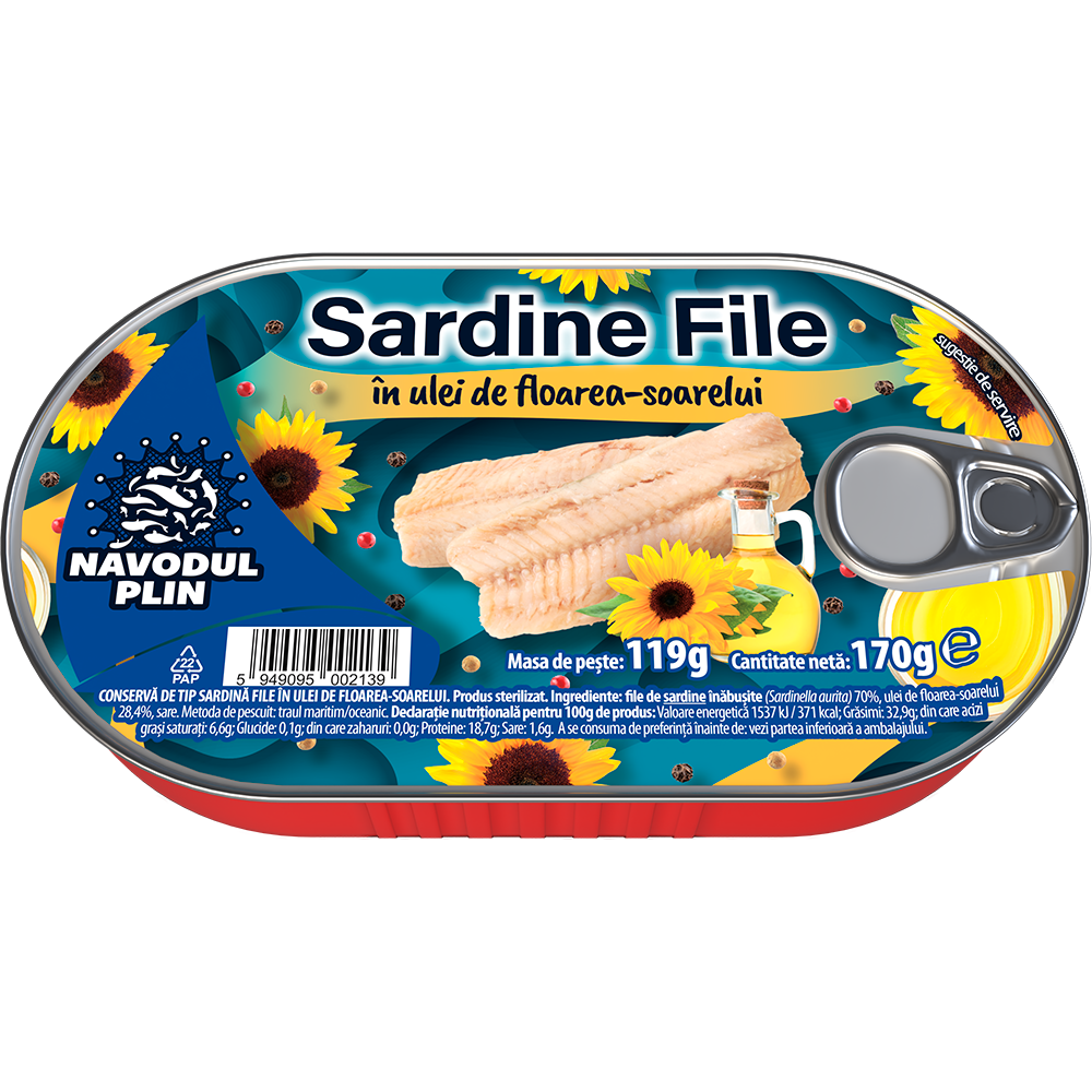 Produs sterilizat. Ingrediente: file de sardine inabusite (Sardinella aurita) 70%, ulei de floarea-soarelui 28,4%, sare. Metoda de pescuit: traul maritim/oceanic.