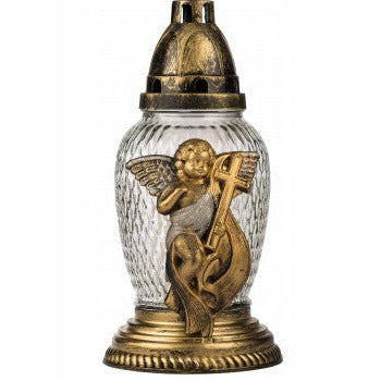 Candela din sticla cu capac din plastic auriu, motiv cruce si ingeras, 255mm