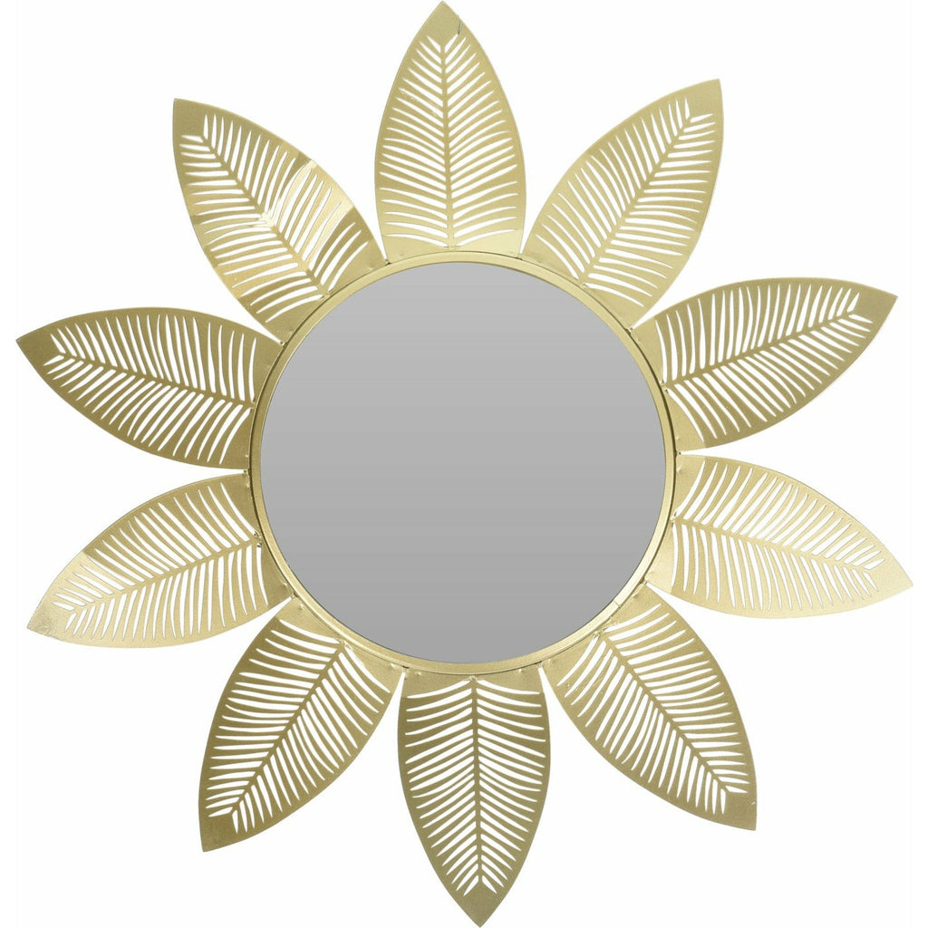 O oglinda suspendata eleganta, aurie, din metal, cu frunze cu structura ajurata, pentru living, dormitor, baie cu diametrul de 55 cm