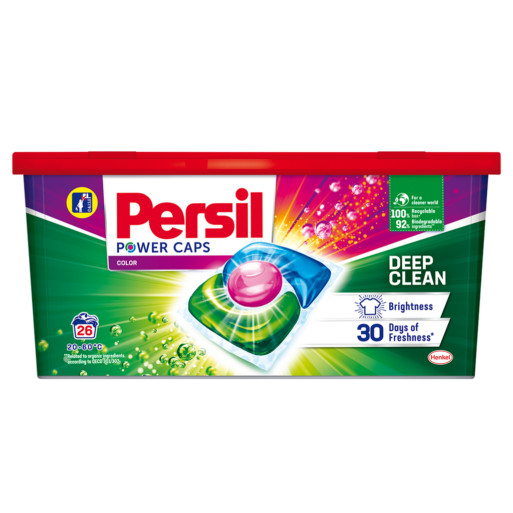 Capsulele Persil cu tehnologie Deep Clean contin o combinatie unica de ingrediente active care actioneaza impotriva petelor incapatanate. Detergentul pentru haine patrunde adanc in fibre, eliminand cele mai mici molecule de pete pentru un rezultat fara pata si stralucirea hainelor. Bucurati-va de curatenia perfecta si prospetimea Persil de lunga durata. Capsulele Persil Power sunt eficiente chiar si la temperaturi scazute, incepand cu 20°C. Pe langa faptul ca este bun pentru hainele tale, este bun si pentru planeta: detergentul pentru rufe vine intr-o cutie 100% reciclabila pentru a promova o lume mai curata.