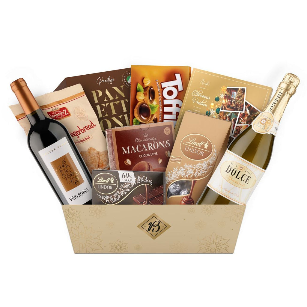 Continut: Turta dulce glazurata Lambertz 160g, Bomboane de pom cu aroma de ciocolata, portocale si mere coapte Christmas Pralines 100g, Pannettone cu stafide si coaja de portocala Prestige 500g, Vin rosu Nostre Terre 750ml, Alune de padure (10%) intr-o cupa de caramel (41%) umplutura cu crema de alune de padure (37%) acoperita cu ciocolata (12%) Toffifee 125g, Spumant Contri 750ml, Bomboane de ciocolata asortate cu umplutura cremoasa (44%) Lindor Lindt 74g, Tableta ciocolata extra neagra cu umplutura cremoasa fina (50%) Lindor Lindt 100g, Macarons umplut cu crema de cacao 60g, Cos cadou.