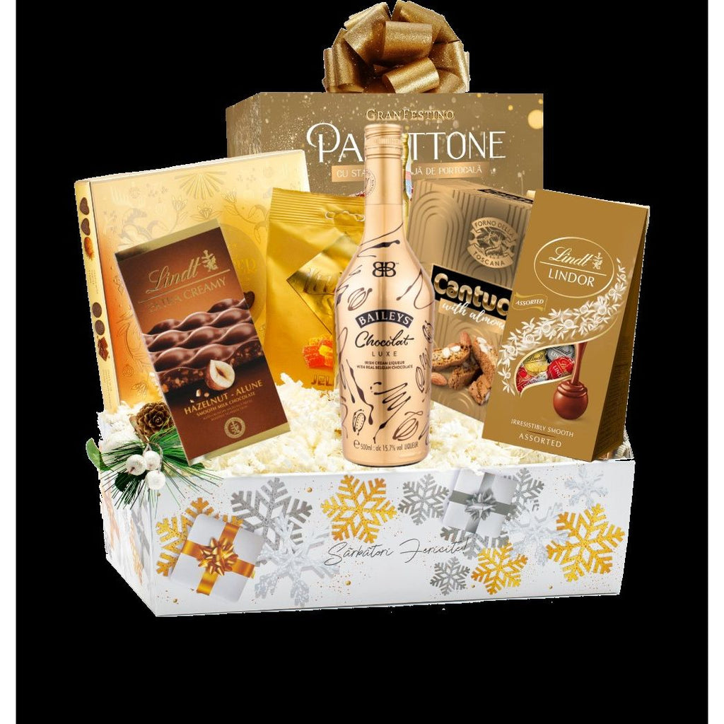 Continut: Lichior Baileys Chocolat Luxe 500ml, Panettone cu stafide si coaja de portocala Gran Festino 500g, Praline de ciocolata Pergale 114g, Jeleuri fructate Luigi's 100g, Tableta de ciocolata Lindt Extra Creamy 80g, Biscuiti crocanti cu migdale Forno della Fontana 100g, Praline de ciocolata Lindt Lindor 75g, Tavita cadou