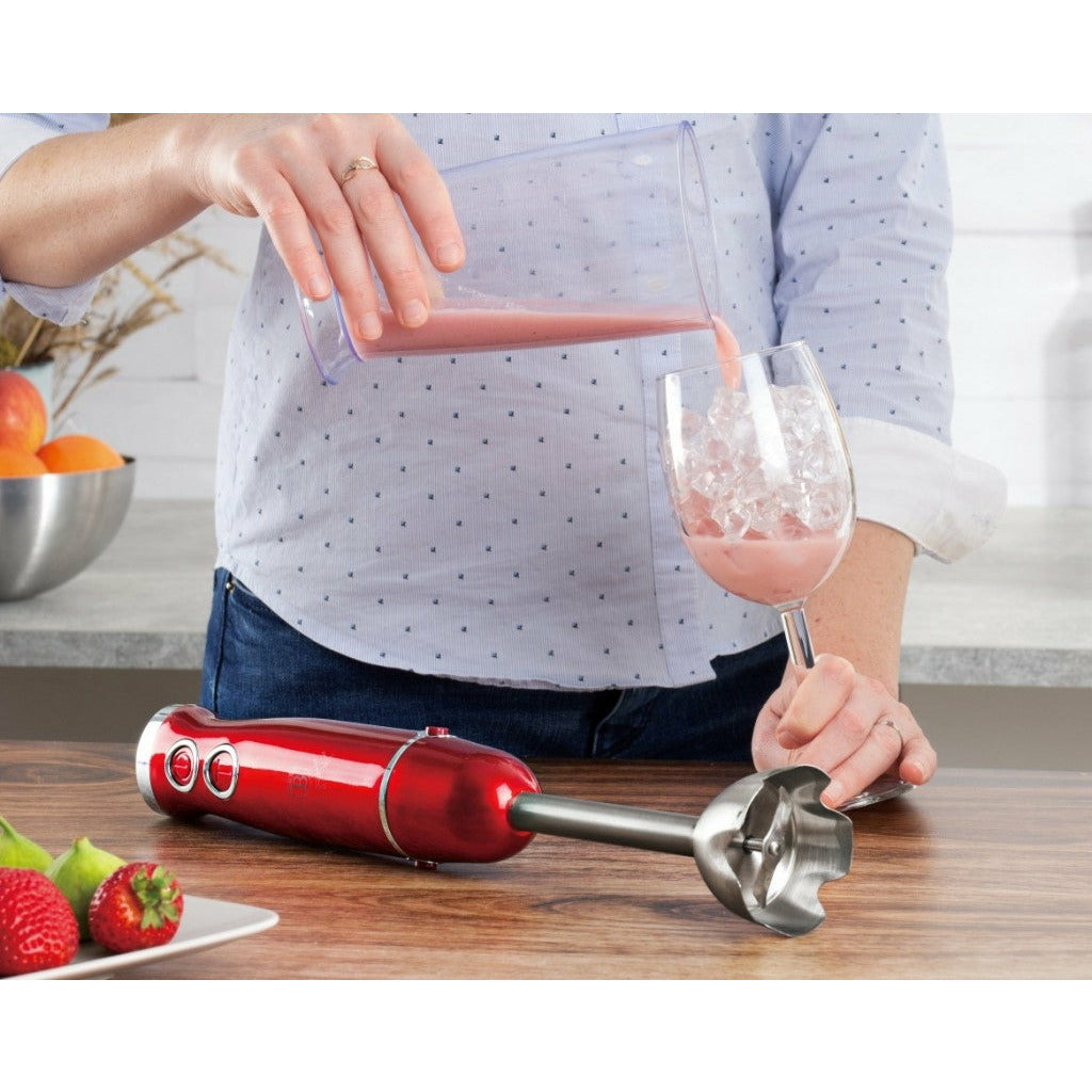 Fabricat prin folosirea de tehnologii inovatoare din otel inoxidabil si plastic de calitate conform standardelor germane, blenderul are functie turbo, 2 viteze si o putere de 500 W. Capatul de amestecare este detasabil ceea ce permite o curatare facila a lui si nu ocupa mult spatiu de depozitare.