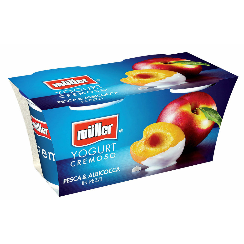Bucura-te de gustul minunat al bucatilor mari de caise si piersici delicioase scufundate in iaurt fin si cremos Muller, intr-un pachet de 2 iaurturi.