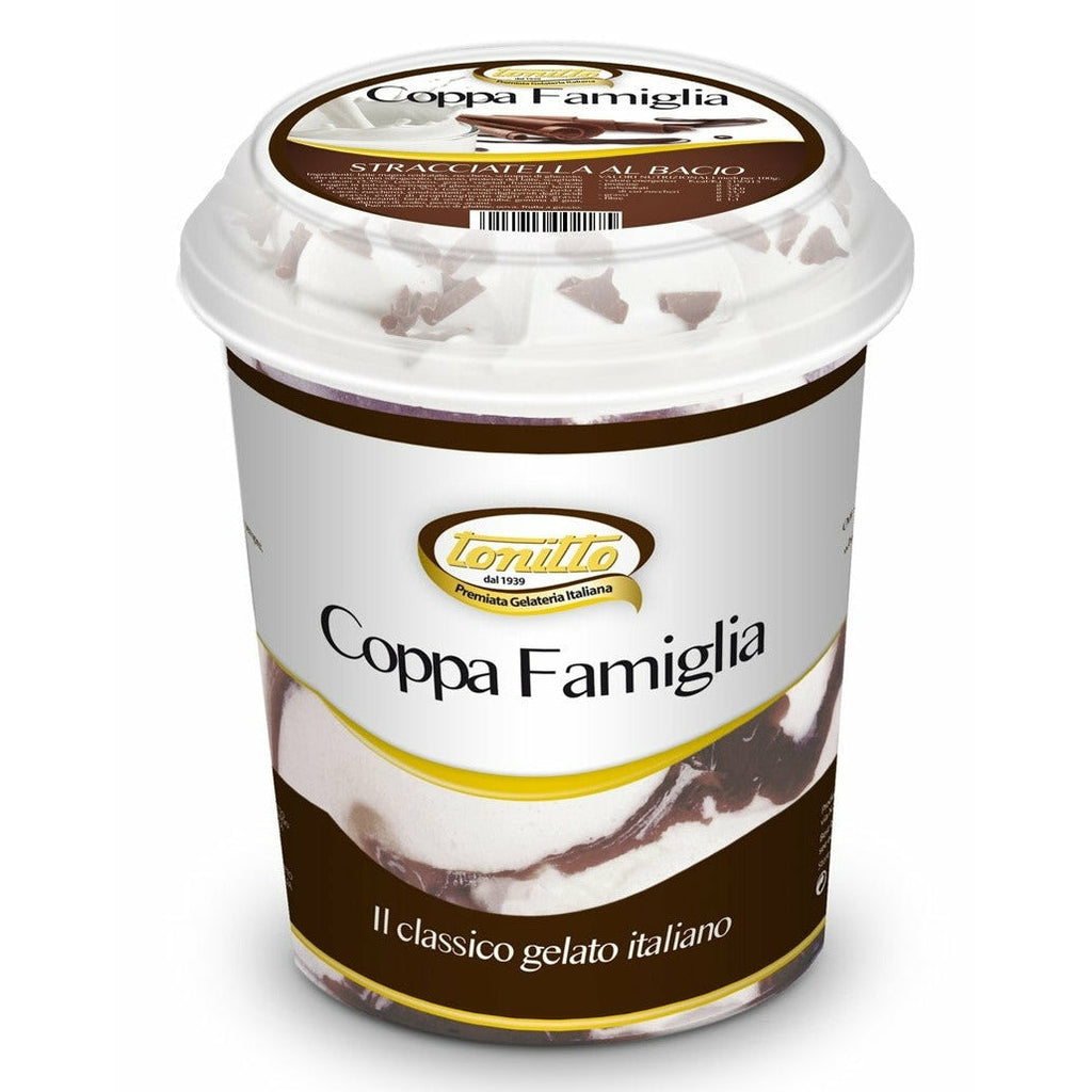 Ambalata intr-un recipient de plastic transparent pentru o apreciere mai buna a texturii, inghetata Tonitto Coppa Famiglia cu stracciatella este destinata familiilor care apreciaza gustul intens al inghetatei autentice italienesti.