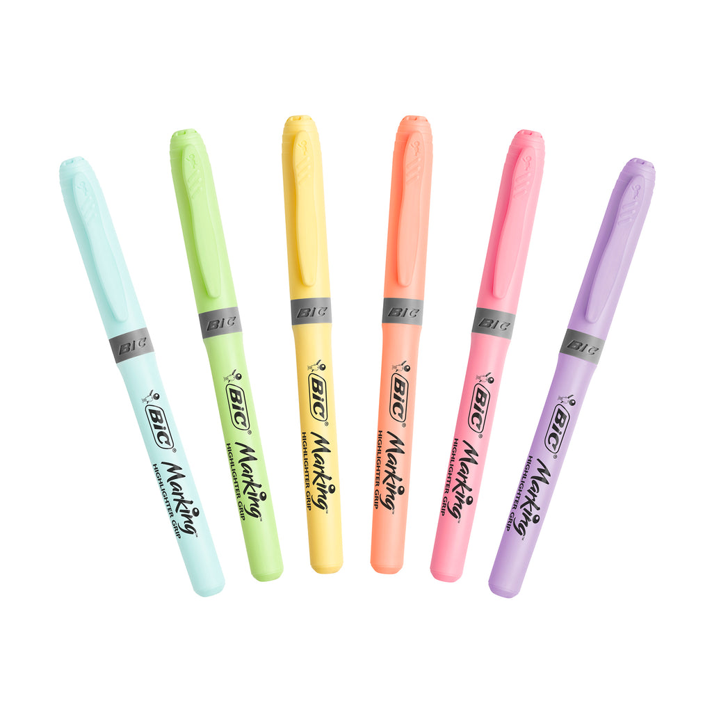 Acest set de 6 evidentiatoare BIC Highlighter contine 6 culori atractive pastel: galben, roz, verde, albastru, mov, portocaliu. Varful tesit inteligent poate fi folosit atat ca evidentiator cu latimea de 3,4 mm, cat si ca marker de subliniat cu o linie subtire de 1,6 mm. Evidentiatoarele dispun de tehnologie anti-uscare de ultima ora, astfel ca pot sa stea fara capac timp de 8 ore.