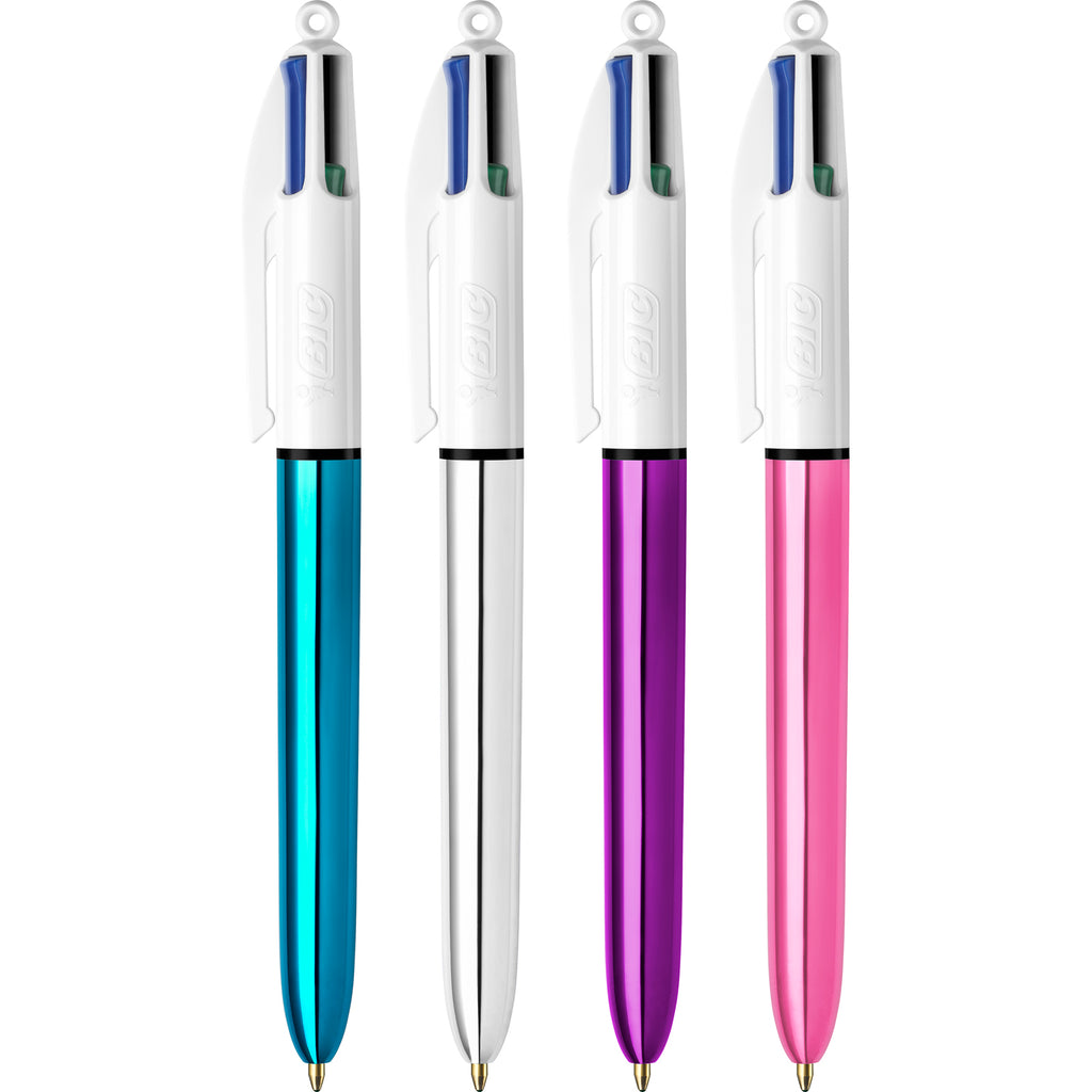 Pixul BIC 4 Colours Shine are un aspect metalic elegant si modern. 4 varfuri medii de 1 mm, in tonuri de albastru, negru, rosu si verde - perfect pentru orice, de la scris si desenat la organizarea notitelor. Acest set contine 1 pix BIC 4 Colours Shine, avand corpul intr-una din cele 4 culori metalice (albastru, roz, argintiu, violet), astfel incat sa puteti schimba culorile printr-o simpla apasare, fara a schimba vreodata pixul.