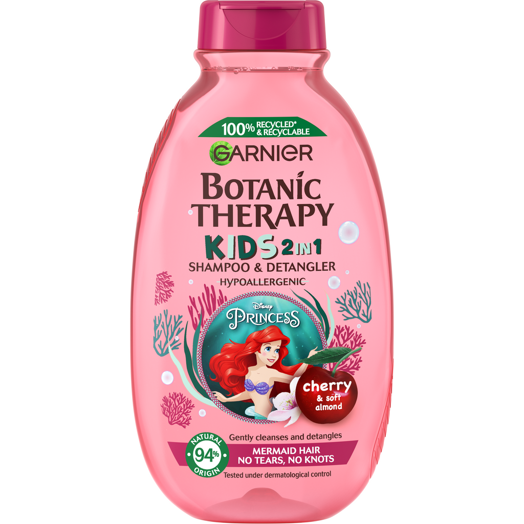 Botanic Therapy iti aduce lumea Disney in propria baie impreuna cu noul 2 in 1 sampon si balsam pentru copii potrivit tuturor tipurilor de par. Formula noastra hipoalergenica si €žfara lacrimi€�, imbogatita cu extract de cirese si ulei de migdale curata, descurca si lasa parul usor de pieptanat. Testat pediatric. Fara silicon pentru o senzatie naturala.