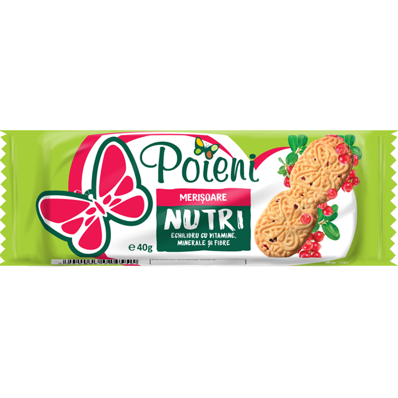 Ingrediente: Faina alba de grau 650, zahar, ulei vegetal nehidrogenat de palmier, amidon din porumb, merisoare deshidratate(5%), apa, stafide(4.6%), sirop de glucoza, inulina (2.3%), agenti de afanare (bicarbonat de amoniu, bicarbonat de sodiu), premix de vitamine si minerale 0.8% (contine fosfat de magneziu Tribasic 5 hidrat, Maltodextrina, Iodura de potasiu, Vitamina B3 €“ Nicotinamida, Vitamina B5 €“ Pantotenat de calciu D, D-Biotina, Vitamina B12,Vitamina B9 €“ Acid folic, Vitamina B6 €“ Clorhidrat de piridoxina), sare iodata, emulsifiant (lecitina din soia), arome, acidifiant (acid citric).