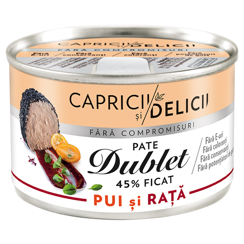 Pate obtinut din ficat de pui 35% si ficat de rata 10%, pasta omogena, fina, tartinabila.