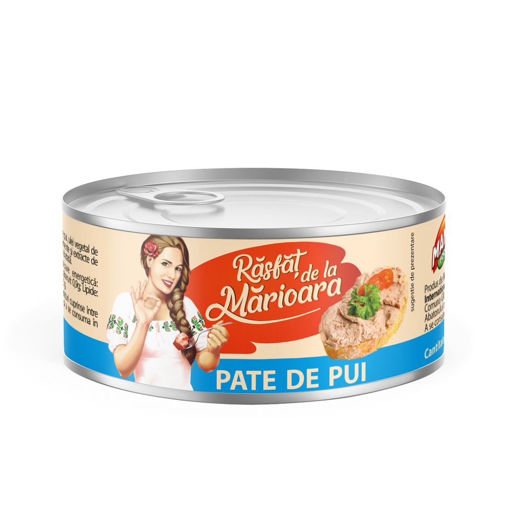 Ingrediente: apa, ficat de pui 16% (origine U.E.), piele de pui, carne de pasare separata mecanic, faina de grau, mix tehnologic (proteina de soia nemodificata genetic, zahar, extracte de condimente si condimente, emulgatori: mono si digliceridele ale acizilor grasi, gelifiant: caragenan, antioxidanti:acid ascorbic si eritorbat de sodiu), concentrat proteic de soia, sare cu nitrit de sodiu, ceapa. Produs sterilizat.