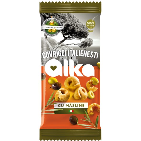 Ingrediente: Faina alba de grau, vin alb, ulei din samburi de masline, pasta de masline negre 2,2%, sare, ulei extravirgin de masline, extract natural de masline. Contine: gluten si sulfiti.