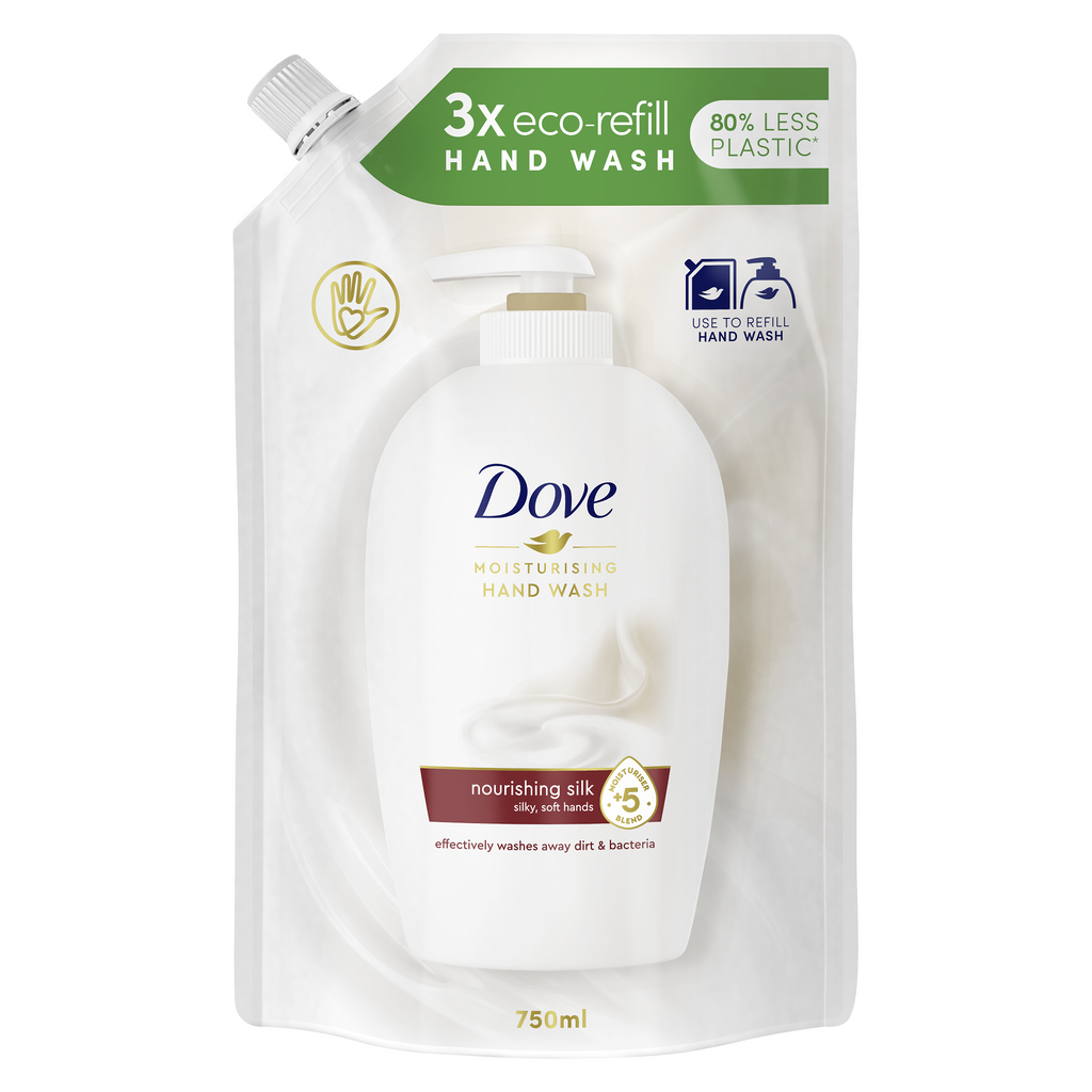 Sapunul-crema lichid Dove Nourishing Silk iti hidrateaza pielea ori de cate ori il folosesti, asa ca te poti bucura de aspectul si senzatia mainilor fine ca matasea in fiecare zi. €¢Cu o noua formula, acum 99% biodegradabila, Dove nu usuca pielea, asa cum fac sapunurile obisnuite;