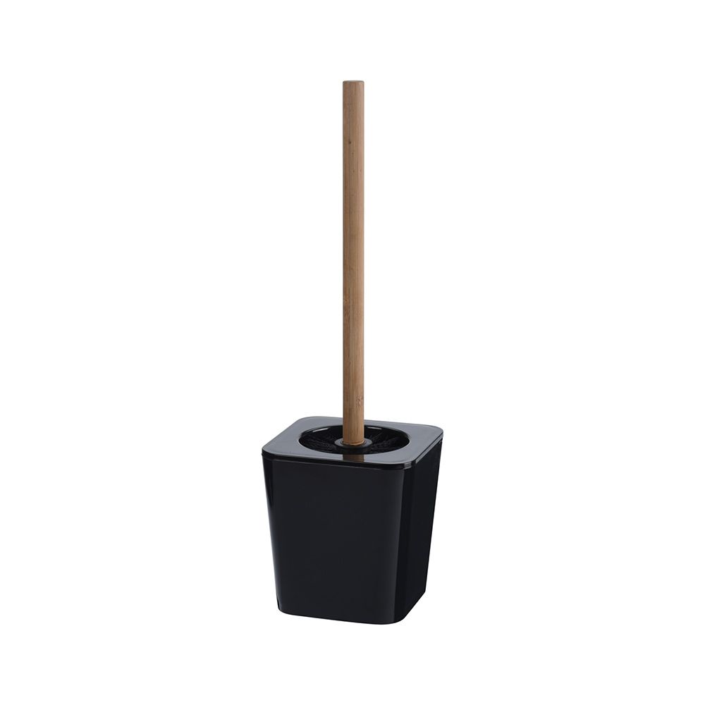 Perie practica de wc cu recipient si suport. Suport negru, maner din lemn de bambus.