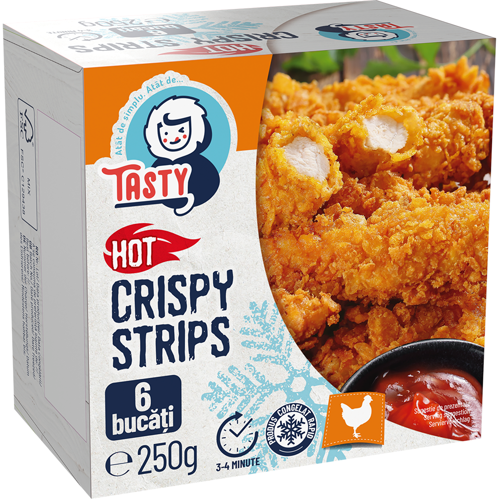 Ai pofta de ceva picant? iti prezentam hot crispy strips, fasii din piept de pui, un preparat delicios, este fraged si suculent la interior si crocant la exterior. Gata de consum in 10-12 minute dupa prajirea in tigaia incinsa.