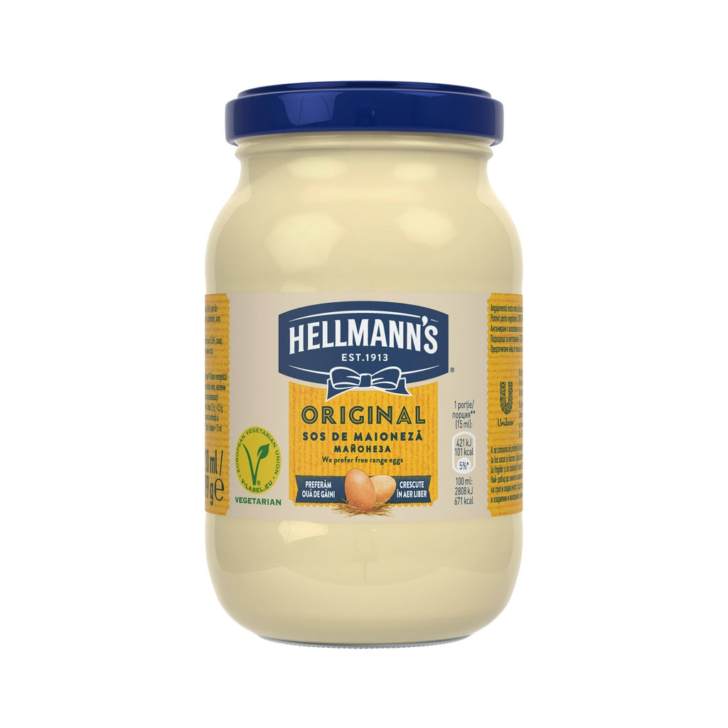 Maioneza preparata cu oua de la gaini crescute la sol si uleiuri de calitate, din surse sustenabile,pentru ca nu ne dorim ca maioneza noastra sa fie buna doar in retetele tale preferate, ci si buna pentru planeta. Richard Hellmann scria €œreal€� pe borcan an 1913, pentru ca asa era maioneza lui. Preparata cu oua de la ferma, asa cum o pregatesti si tu in bucatarie. La fel stau lucrurile si azi. Credem in mancare adevarata, creata din ingrediente simple si bune, asa ca preparam sosul original de maioneza cu ingrediente naturale, alese cu grija.