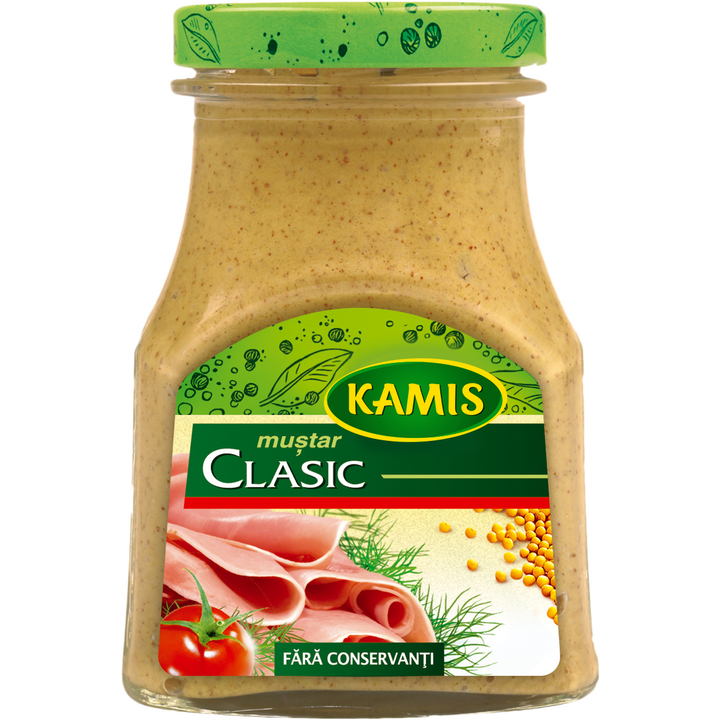 Mustar Clasic €“ este un mustar potrivit de iute cu un gust clasic, o consistenta densa si culoarea standard cu bucati vizibile maiintunecate ale boabelor de mustar. Aroma si gustul inegalabile ale mustarului Kamis sunt meritul retetelor unicat, soiului boabelor de mustar selectionate special, condimentelor alese cu mare grija si a altor componente de calitate superioara.in plus calitatea mustarului Kamis este si rezultatul unui proces de productie suficient de lent si a procedeului de dospire. Numaiin acest fel toate componenteleisi pot dezvoltain totalitate valorile sale gustative si olfactive. Un borcan cu forma estetica, cu capacul asigurat care garanteaza ca fiecare mustar va ramane neatins panain clipain care va ajungein mainile cumparatorului.