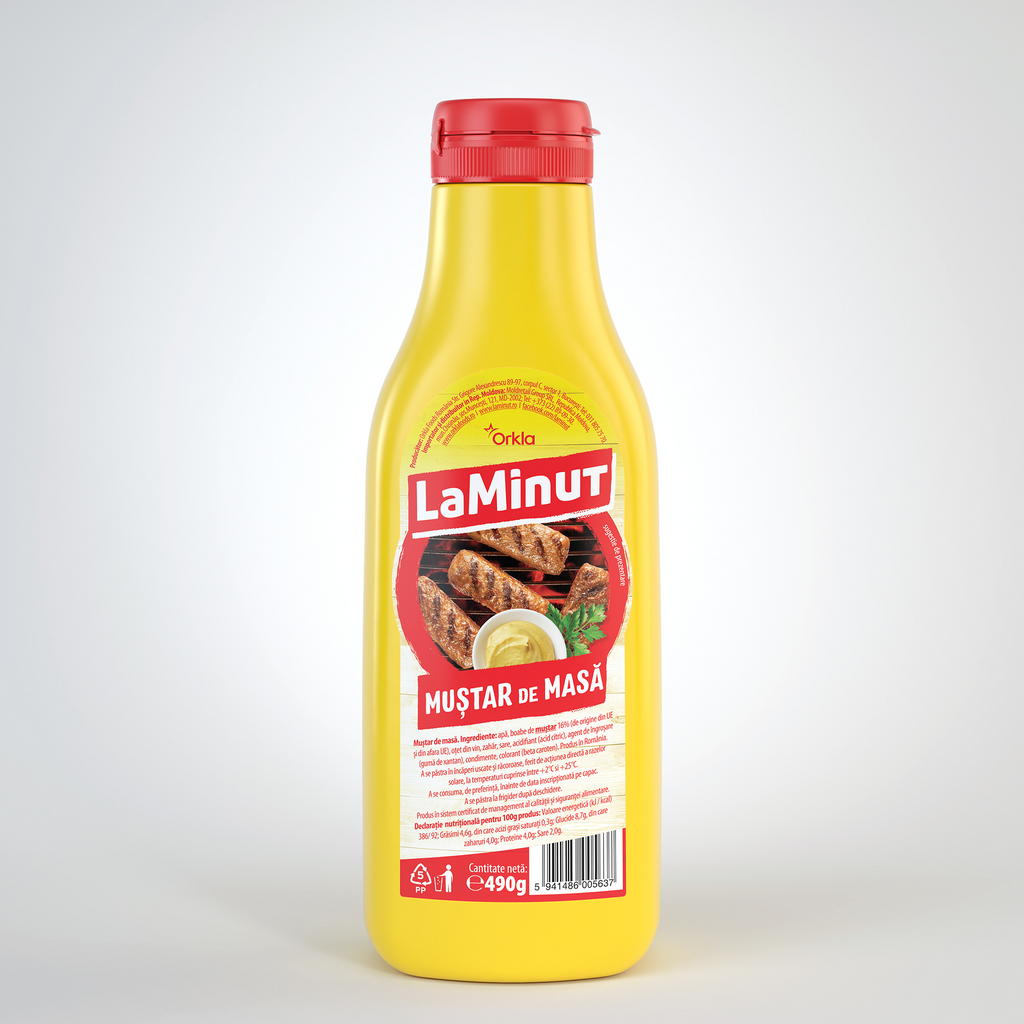 Ingrediente: Apa; boabe de mustar 16% (de origine din UE si din afara UE); otet din vin; zahar; sare; acidifiant (acid citric); agent de ingrosare (guma de xantan); condimente; colorant (beta caroten).