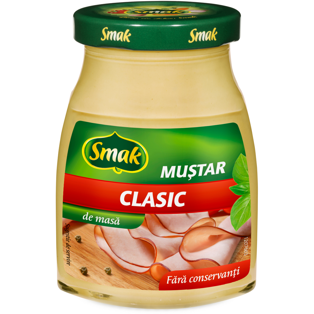 Mustar clasic, fin, din boabe de mustar. Recomandat pentru fripturi si preparate din carne, ca dressing sau in sandviciuri. Nu contine conservanti.