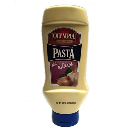 Ingrediente: apa 66%, ulei vegetal de floarea soarelui 20%, amidon modificat din porumb, zahar, sare iodata, usturoi deshidratat 2%, otet din alcool, acidifiant( acid citric), stabilizatori( guma guar, guma xantan), conservanti( benzoat de sodiu, sorbat de potasiu), antioxidant ( calciu disodic).
