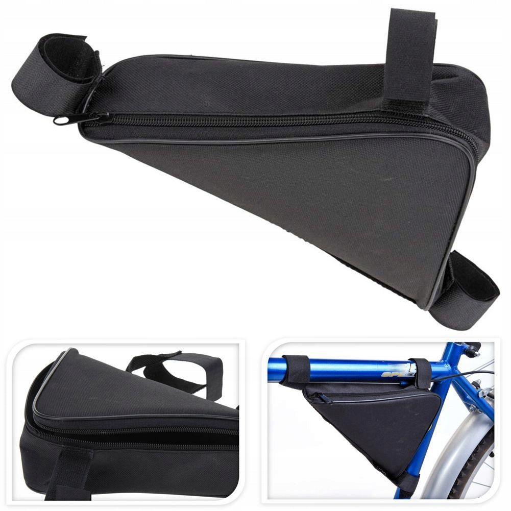 Geanta universala neagra pentru cadru de bicicleta. Geanta de depozitare este atasata cu autocolante stranse intre tubul orizontal si tubul inferior al rotii. Geanta de biciclete triunghiulara este in general potrivita pentru aproape toate bicicletele cu o zona triunghiulara intre tuburile cadrului. Geanta de bicicleta are fermoar de inalta calitate. Geanta robusta pentru biciclete contine haine de schimb, o gluga de ploaie, un telefon si o gustare.
