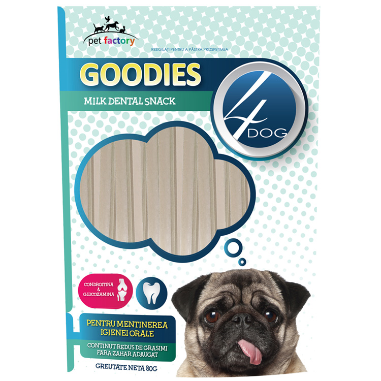 Hrana complementara pentru caini de orice talie si varsta, 100% naturala, din ingrediente de cea mai buna calitate. Recompensele pentru caini 4DOG Goodies Dental Sticks Lapte si Glucozamina au un continut de grasimi foarte scazut (0.2%), proteine din derivate de origine vegetala si fara zahar adaugat. INGREDIENTE: derivate de origine vegetala, cereale, sirop de malt, lapte (7.3%), uleiuri si grasimi, glicerina, sorbitol, condroitin sulfat (0.5%), glucozamina (0.2%), minerale. ANALIZA NUTRITIONALA: Proteina - 9.5%, Grasimi - 0.2%, Fibre - 1.5%, Umiditate - 14%.