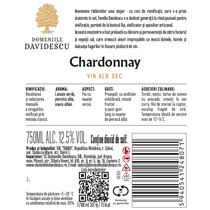 Chardonnay este un vin alb sec, maturat ƒ®n barrique franˆ€ºuzesc, cu parfum de miere, par„ƒ ˆ„¢i ananas. Gust proasp„ƒt ˆ„¢i rotund, completat de note fine de pƒ¢ine pr„ƒjit„ƒ. Elegant ˆ„¢i echilibrat, perfect cu pui la gr„ƒtar, fructe de mare sau tartar de somon. Temperatura ideal„ƒ de servire: 14‚°C.