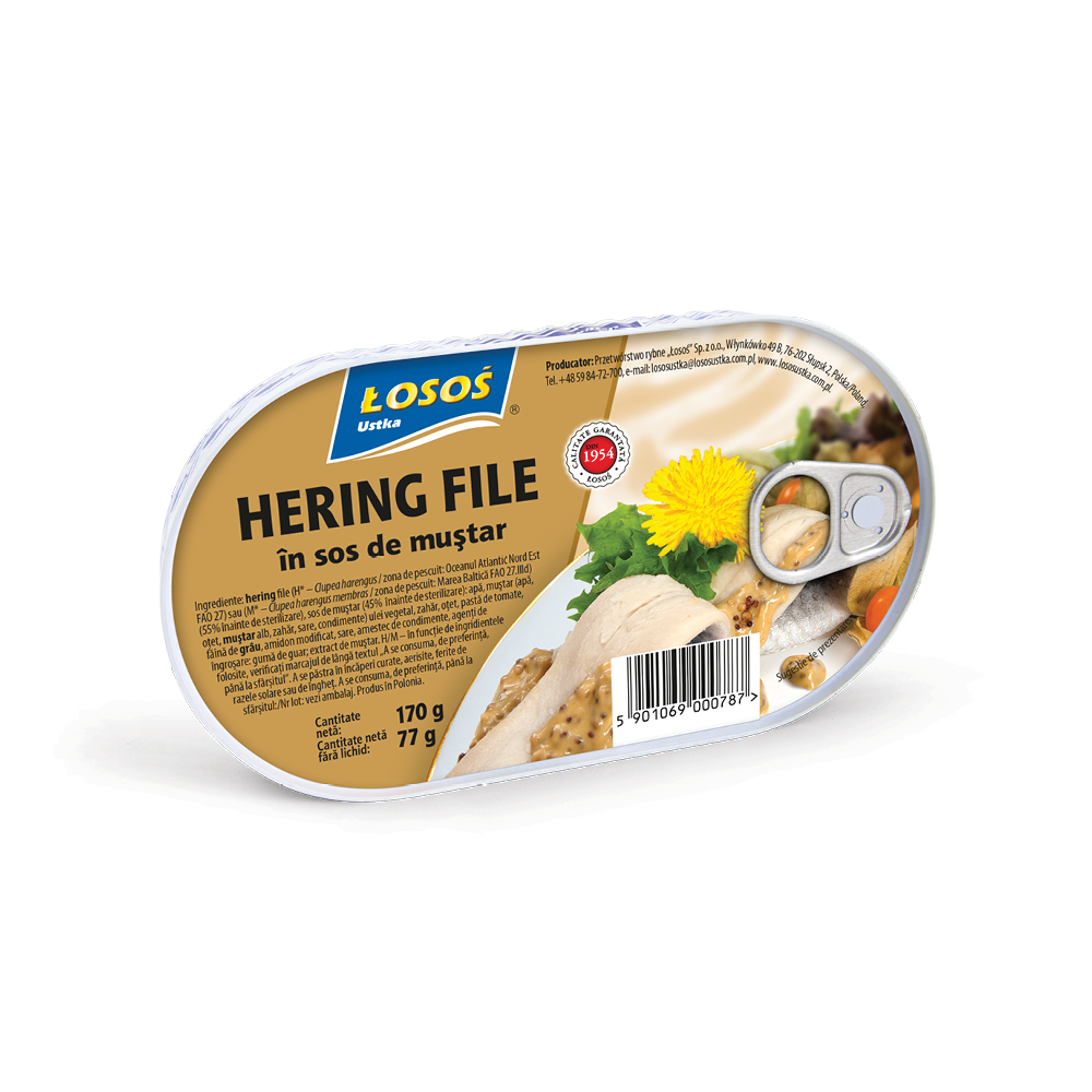 Ingrediente: fileuri de hering atlantic (Clupea harengus / zona de capturare: H* - Atlanticul de Nord-Est FAO 27 sau K* - Atlanticul de Nord-Vest FAO 21) sau baltic (Clupea harengus membras / zona de capturare: M* - Marea Baltica FAO 27 .IIId) (55% inainte de sterilizare), sos de mustar (45% inainte de sterilizare): apa, mustar (apa, otet, mustar alb, zahar, sare, condimente), ulei de rapita, zahar, otet, pasta de rosii, faina de grau, amidon de porumb modificat, sare, extracte de condimente, agent de ingrosare: guma guar; aroma de mustar.*H/K/M €“ in functie de ingredientele folosite: uitati-va la marcajul de langa codul lotului; prins de traul pelagic.