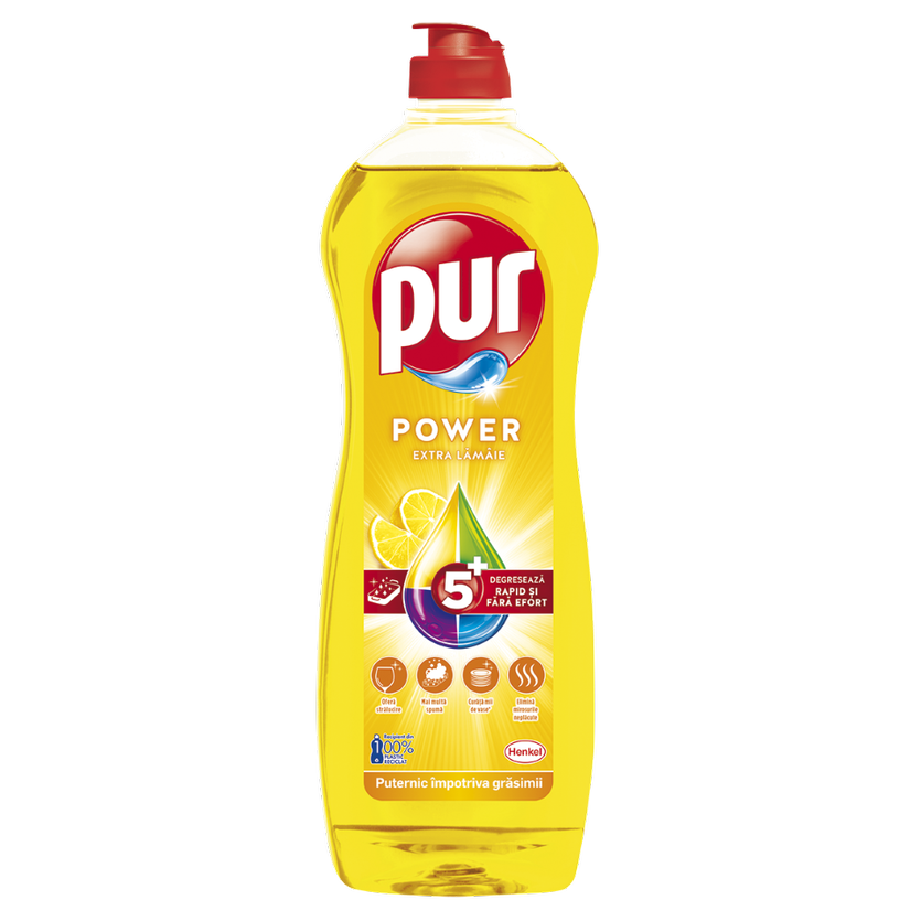 Noua formula Pur Power 5+ dizolva grasimea rapid si fara efort, fara a fi nevoie de o spalare intensa.* (DISCLAIMER 1).