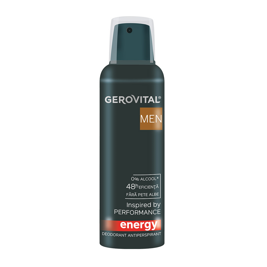 Gerovital Men Deodorant Antiperspirant Energy are o formula exclusiva de deodorant-antiperspirant, lipsita de alcool*, cu un parfum masculin durabil. Produsul asigura o protectie eficienta impotriva transpiratiei timp de 48 h. Nu lasa pete albe pe haine. Pielea se simte confortabil. Fara iritatii. Fara efect lipicios. Succesul, farmecul si masculinitatea - sunt cuvintele cheie care descriu aroma acestui deodorant.