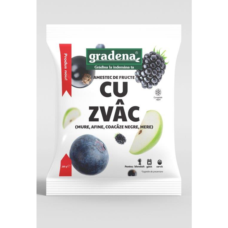 Amestec de fructe cu Zvac, este un amestec de fructecongelate care contine 4 componente diferite: mure, afine, mere cuburi si coacaze negre.