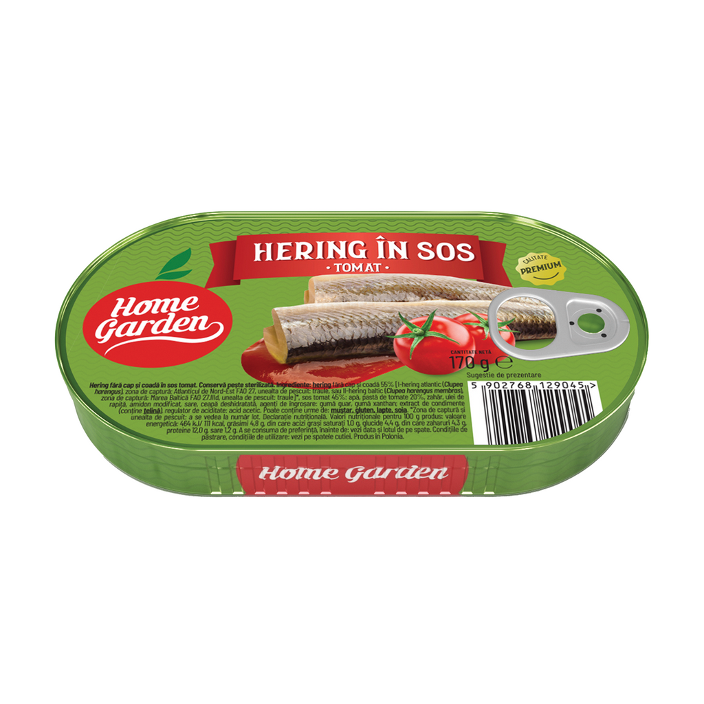 Ingrediente : Hering fara cap si coada 55%, sos tomat 45%: apa, concentrat de tomate 20%, zahar, ulei de rapita, amidon modificat, sare, ceapa deshidratata, agenti de ingrosare: guma guar, guma xanthan; extract de condimente (contine telina), regulator de aciditate: acid acetic.