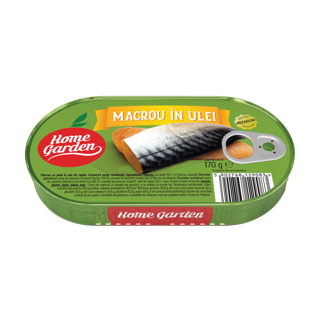 Ingrediente : Macrou cu piele 60%, ulei de rapita 40%, sare.