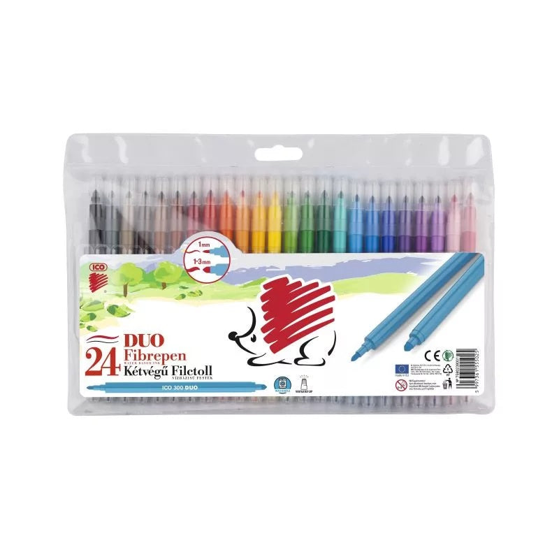 Carioci cu doua capete pentru uz general, umplut cu vopsea pe baza de apa pentru scris, desen si colorat. Are corp din plastic si capac ventilat. Vopseaua este lavabila. Grosimea liniei: 1 mm; 1-3 mm.