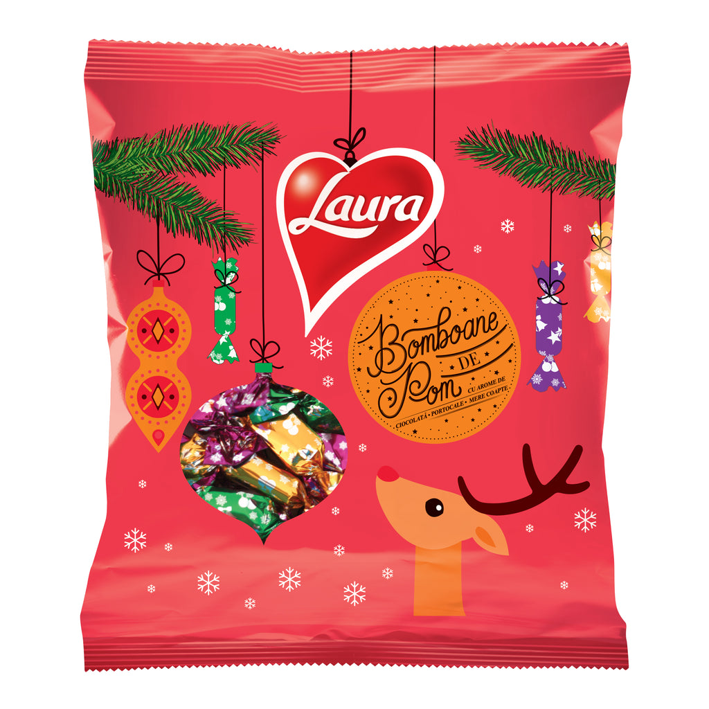 Laura Bomboane de pom cu arome de ciocolata, portocale, mere coapte, cu umplutura cu aroma de ciocolata, portocale, mere coapte si glazura de cacao.