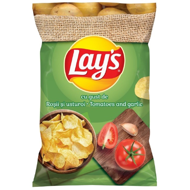 Ingrediente: cartofi,uleiuri vegetale( porumb, floarea soarelui, rapita in proportii variabile), mix de ingrediente cu gust de rosii si usturoi (lactoza, sare , zahar, potentiatori de aroma (monuglutamat de sodiu, ribonucleotide disodice, dextroza, ceapa pudra, ardei paprica pudra, proteina vegetala hidrolizata, arome, aroma de fum, rosii pudra 0.06%, usturoi pudra 0.06%, patrunjel, corectori de aciditate( acid citric, acid malic), colorant( extract de ardei rosu), indulcitor( aspartam).