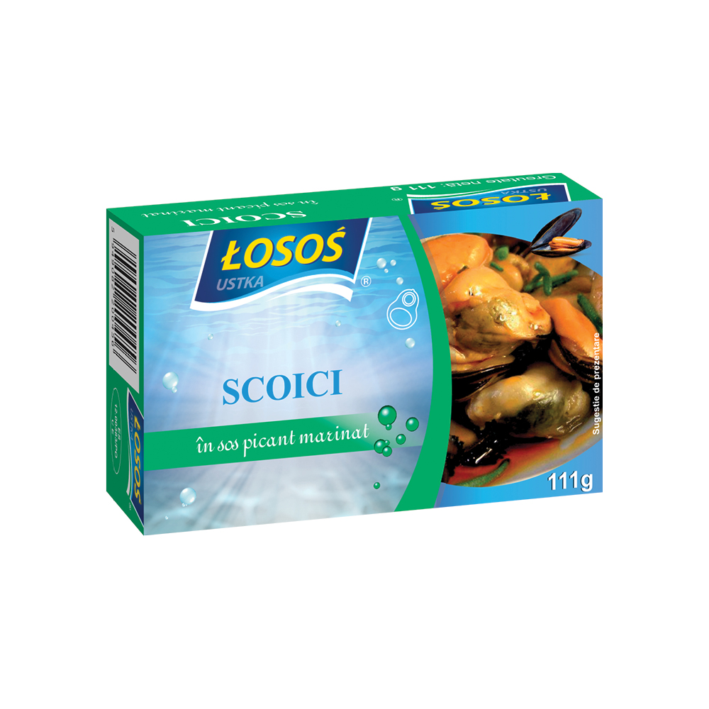 Ingrediente: scoici (midii), ulei de floarea soarelui, otet, apa, amidon, aroma naturala de ardei chili, aroma naturala de marinada, colorant (extract de paprika), usturoi, cuisoare, ardei, dafin.
