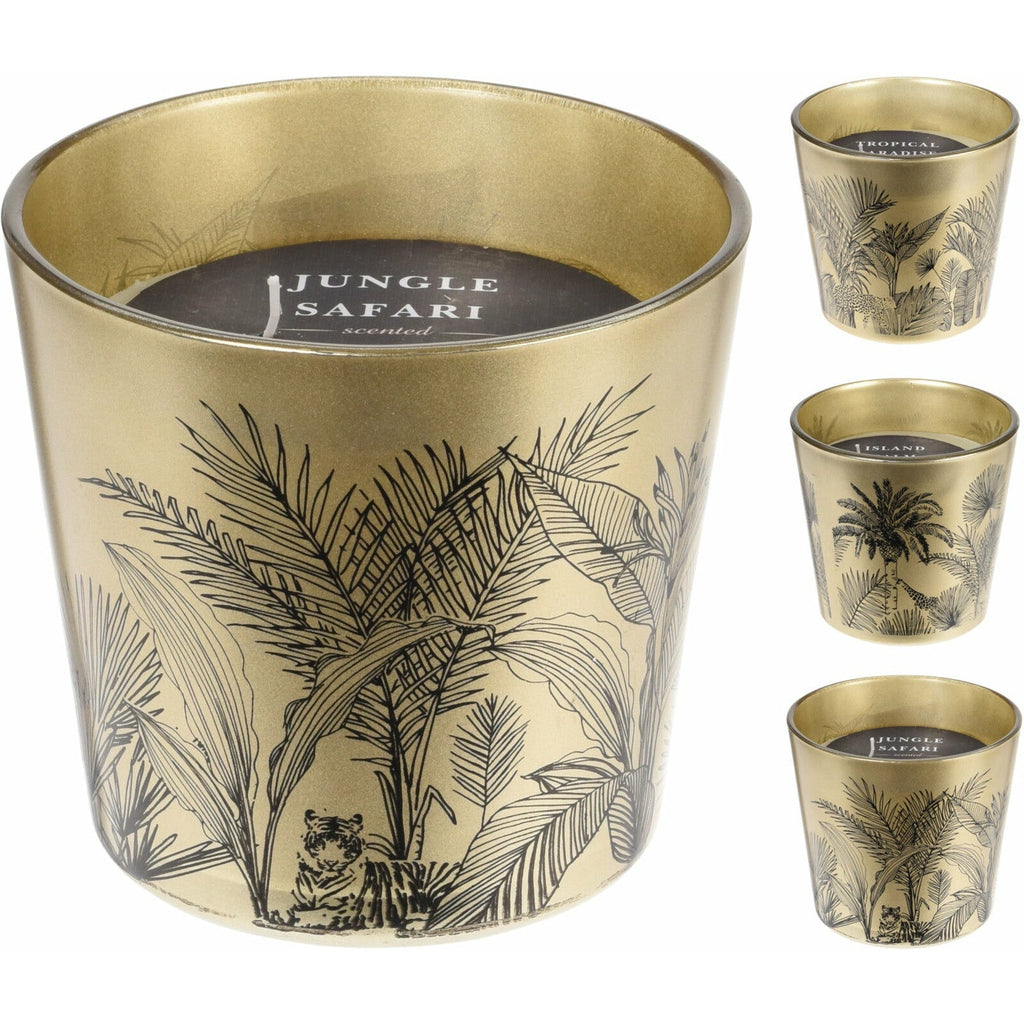 Paharele lumanarilor au un imprimeu exotic. Sunt de culoare aurie si au un imprimeu frumos plin de copaci, plante si animale exotice. Te imaginezi complet intr-o jungla frumoasa cu animale speciale, cum ar fi un tigru, girafa si un leopard.