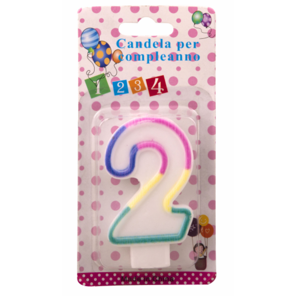 Lumanare aniversara, cifra 2, din parafina, inaltime 7 cm, multicolor, 1 bucata pe blister.